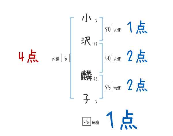 総運![]() | 小沢麟子さんの総運は46画の1つ星!迷走することが多く苦労するかも。目先のことにとらわれないように。 あなたの人生を表す1番重要な運勢です。生涯を通じて影響する総合運となり、主に50歳以降の晩年期に影響を及ぼします。 |