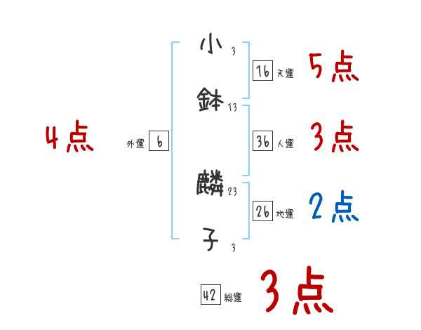 外運![]() | 小鉢麟子さんの外運は6画の4つ星!慎重な努力家で信頼を得る。誠実な精神で向上心に優れる。 生活面を象徴する運勢です。外部から受ける影響力を表し、結婚運、家庭運や職場、環境への順応性を表します。 |