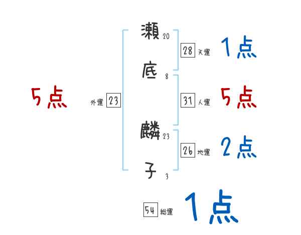天運![]() | 瀬底麟子さんの天運は28画の1つ星!家庭環境に注意。スポーツで活躍できる能力があるかも。 家系が持つ宿命的な運勢を表します。祖先から受け継いだ苗字ですので自分の力が及びません。家柄を象徴します。 |