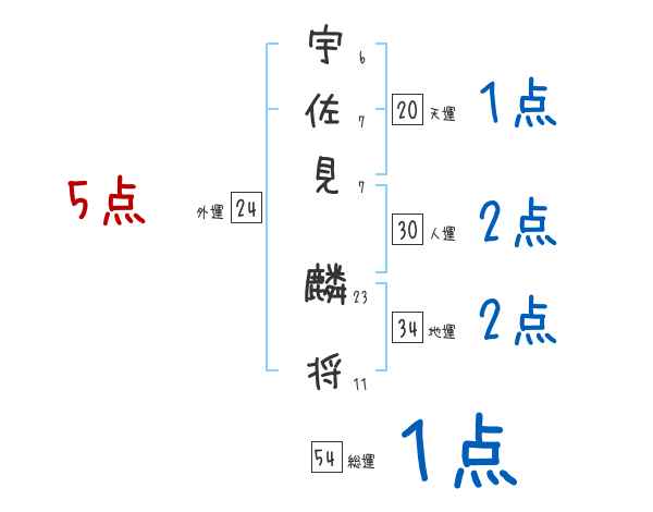 総運![]() | 宇佐見麟将さんの総運は54画の1つ星!トラブルが多いかも。周りをよく見て協調して過ごしましょう。 あなたの人生を表す1番重要な運勢です。生涯を通じて影響する総合運となり、主に50歳以降の晩年期に影響を及ぼします。 |