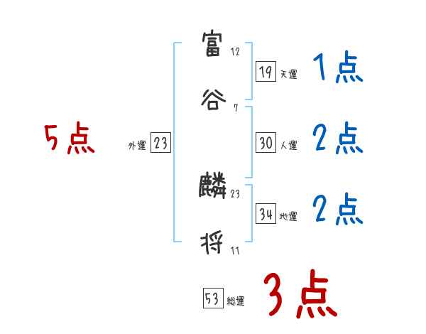 総運![]() | 富谷麟将さんの総運は53画の3つ星!やや見栄っ張りで虚栄心がある。散財に注意。 あなたの人生を表す1番重要な運勢です。生涯を通じて影響する総合運となり、主に50歳以降の晩年期に影響を及ぼします。 |