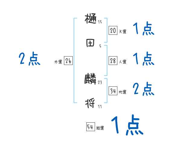 外運![]() | 樋田麟将さんの外運は26画の2つ星!波瀾万丈かも。信頼できる人を大事にしましょう。 生活面を象徴する運勢です。外部から受ける影響力を表し、結婚運、家庭運や職場、環境への順応性を表します。 |