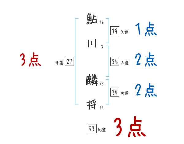 総運![]() | 鮎川麟将さんの総運は53画の3つ星!やや見栄っ張りで虚栄心がある。散財に注意。 あなたの人生を表す1番重要な運勢です。生涯を通じて影響する総合運となり、主に50歳以降の晩年期に影響を及ぼします。 |