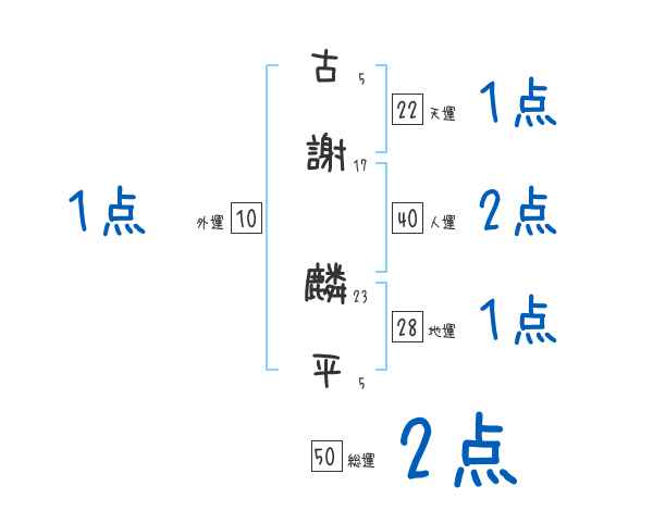 天運![]() | 古謝麟平さんの天運は22画の1つ星!努力することが苦手ないっぽう手先が器用。芸術性にも優れる。 家系が持つ宿命的な運勢を表します。祖先から受け継いだ苗字ですので自分の力が及びません。家柄を象徴します。 |