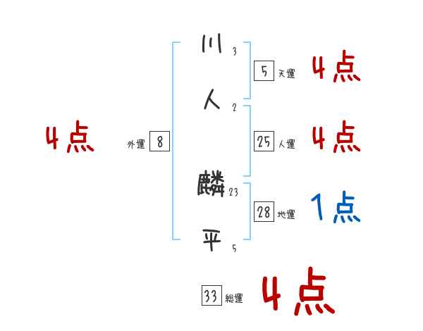 総運![]() | 川人麟平さんの総運は33画の4つ星!権力志向でプライドが高い。勇気があり運を切り開き成功する。 あなたの人生を表す1番重要な運勢です。生涯を通じて影響する総合運となり、主に50歳以降の晩年期に影響を及ぼします。 |