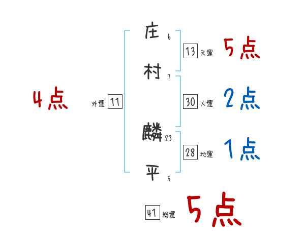 天運![]() | 庄村麟平さんの天運は13画の5つ星!才能に恵まれ人気がある。名声を手に入れる。円満な人生。 家系が持つ宿命的な運勢を表します。祖先から受け継いだ苗字ですので自分の力が及びません。家柄を象徴します。 |