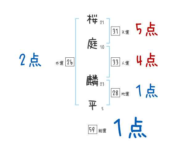 総運![]() | 桜庭麟平さんの総運は59画の1つ星!意志の弱さであきらめることが多いかも。粘り強さが必要。 あなたの人生を表す1番重要な運勢です。生涯を通じて影響する総合運となり、主に50歳以降の晩年期に影響を及ぼします。 |