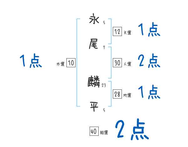 総運![]() | 永尾麟平さんの総運は40画の2つ星!自信過剰で物事に固執するためトラブルに注意。 あなたの人生を表す1番重要な運勢です。生涯を通じて影響する総合運となり、主に50歳以降の晩年期に影響を及ぼします。 |