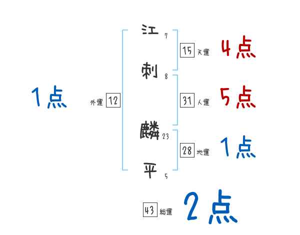 総運![]() | 江刺麟平さんの総運は43画の2つ星!頑固な性格で独立心が強いかも。やや非現実的で浪費に注意しましょう。 あなたの人生を表す1番重要な運勢です。生涯を通じて影響する総合運となり、主に50歳以降の晩年期に影響を及ぼします。 |