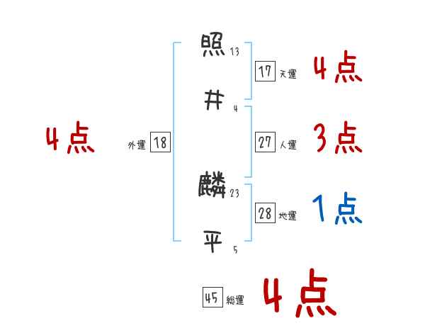 地運![]() | 照井麟平さんの地運は28画の1つ星!家庭環境に注意。スポーツで活躍できる能力があるかも。 個性を表す基礎的な運勢です。性格形成や対人関係、行動力など家庭環境に影響されます。主に誕生してから20歳くらいまでの若年期の運勢を表します。 |