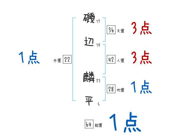 外運![]() | 磯辺麟平さんの外運は22画の1つ星!努力することが苦手ないっぽう手先が器用。芸術性にも優れる。 生活面を象徴する運勢です。外部から受ける影響力を表し、結婚運、家庭運や職場、環境への順応性を表します。 |