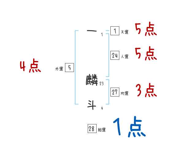 天運![]() | 一麟斗さんの天運は1画の5つ星!行動力、指導力があり出世し繁栄する。幸運に恵まれる。 家系が持つ宿命的な運勢を表します。祖先から受け継いだ苗字ですので自分の力が及びません。家柄を象徴します。 |