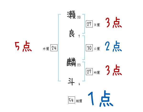 総運![]() | 瀬良麟斗さんの総運は54画の1つ星!トラブルが多いかも。周りをよく見て協調して過ごしましょう。 あなたの人生を表す1番重要な運勢です。生涯を通じて影響する総合運となり、主に50歳以降の晩年期に影響を及ぼします。 |