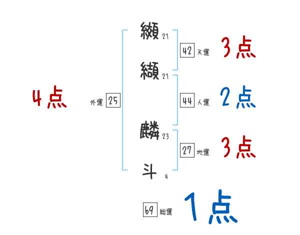 天運![]() | 纐纈麟斗さんの天運は42画の3つ星!病気に注意。多芸であるが消極的でおとなしい。 家系が持つ宿命的な運勢を表します。祖先から受け継いだ苗字ですので自分の力が及びません。家柄を象徴します。 |