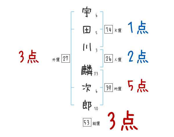 天運![]() | 宇田川麟次郎さんの天運は14画の1つ星!人に対して優しいがストレスを溜め込みがち。人間関係のトラブルを避けるよう気をつけましょう。 家系が持つ宿命的な運勢を表します。祖先から受け継いだ苗字ですので自分の力が及びません。家柄を象徴します。 |