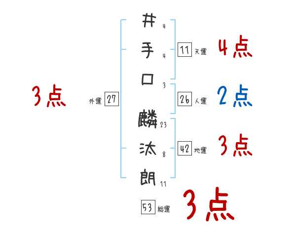外運![]() | 井手口麟汰朗さんの外運は27画の3つ星!頭脳明晰だが強情で摩擦が多い傾向。孤立に注意。 生活面を象徴する運勢です。外部から受ける影響力を表し、結婚運、家庭運や職場、環境への順応性を表します。 |