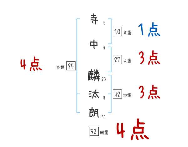 天運![]() | 寺中麟汰朗さんの天運は10画の1つ星!不安を感じやすい傾向。ストレスを抱えないように注意しましょう。 家系が持つ宿命的な運勢を表します。祖先から受け継いだ苗字ですので自分の力が及びません。家柄を象徴します。 |