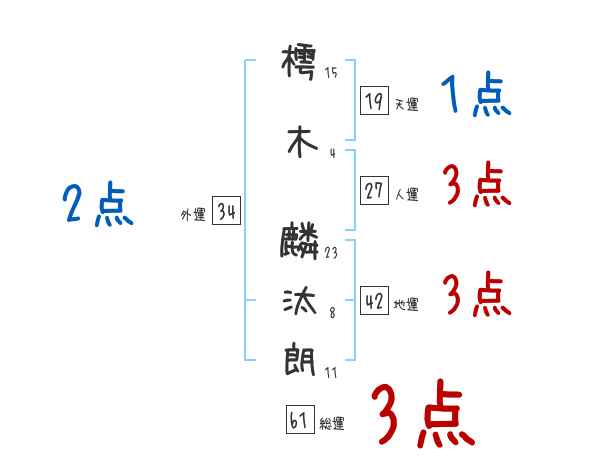 総運![]() | 樗木麟汰朗さんの総運は61画の3つ星!強情な性格でうぬぼれタイプ。自ら破滅する。 あなたの人生を表す1番重要な運勢です。生涯を通じて影響する総合運となり、主に50歳以降の晩年期に影響を及ぼします。 |
