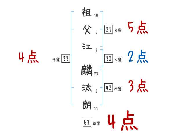天運![]() | 祖父江麟汰朗さんの天運は21画の5つ星!統率力がある。独立し成功する。名誉を手に入れる。 家系が持つ宿命的な運勢を表します。祖先から受け継いだ苗字ですので自分の力が及びません。家柄を象徴します。 |