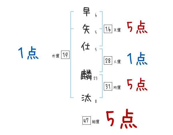天運![]() | 早矢仕麟汰さんの天運は16画の5つ星!人望が厚く大きく発展する。逆転成功が見える。 家系が持つ宿命的な運勢を表します。祖先から受け継いだ苗字ですので自分の力が及びません。家柄を象徴します。 |