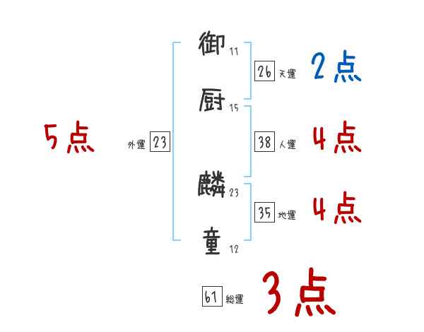 天運![]() | 御厨麟童さんの天運は26画の2つ星!波瀾万丈かも。信頼できる人を大事にしましょう。 家系が持つ宿命的な運勢を表します。祖先から受け継いだ苗字ですので自分の力が及びません。家柄を象徴します。 |