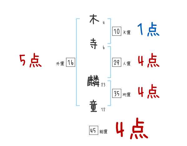 天運![]() | 木寺麟童さんの天運は10画の1つ星!不安を感じやすい傾向。ストレスを抱えないように注意しましょう。 家系が持つ宿命的な運勢を表します。祖先から受け継いだ苗字ですので自分の力が及びません。家柄を象徴します。 |