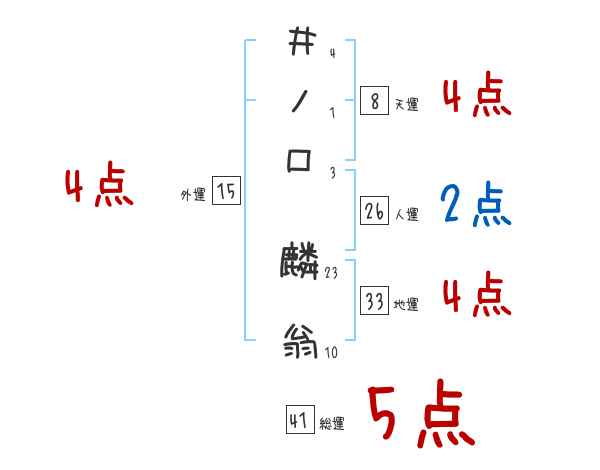 総運![]() | 井ノ口麟翁さんの総運は41画の5つ星!大志を抱き、目標に向かって実力を発揮し達成する。温和な性格。 あなたの人生を表す1番重要な運勢です。生涯を通じて影響する総合運となり、主に50歳以降の晩年期に影響を及ぼします。 |