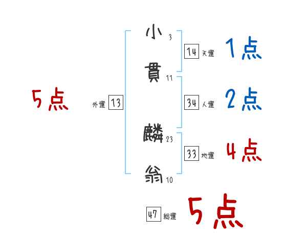 総運![]() | 小貫麟翁さんの総運は47画の5つ星!実力が開花し発展する円満な人生。財に恵まれる。 あなたの人生を表す1番重要な運勢です。生涯を通じて影響する総合運となり、主に50歳以降の晩年期に影響を及ぼします。 |