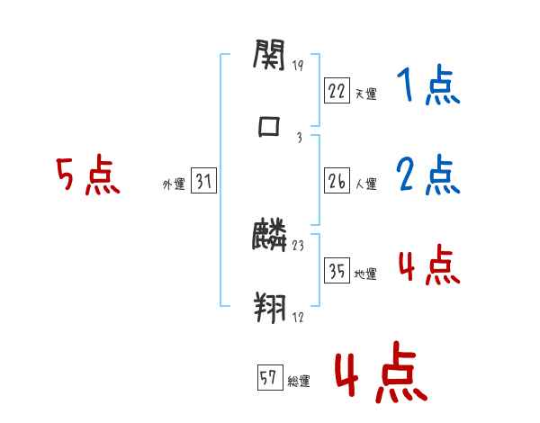 総運![]() | 関口麟翔さんの総運は57画の4つ星!向上心があり人望がある。地位を得る。 あなたの人生を表す1番重要な運勢です。生涯を通じて影響する総合運となり、主に50歳以降の晩年期に影響を及ぼします。 |