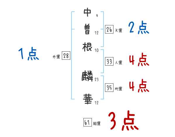 人運![]() | 中曽根麟華さんの人運は33画の4つ星!権力志向でプライドが高い。勇気があり運を切り開き成功する。 性格や才能などを表す2番目に重要な運勢です。人間関係や協調性、社会的な成功に影響します。主に20歳から50歳ぐらいまでの中年期の運勢を表します。 |