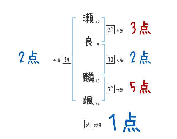 天運![]() | 瀬良麟颯さんの天運は27画の3つ星!頭脳明晰だが強情で摩擦が多い傾向。孤立に注意。 家系が持つ宿命的な運勢を表します。祖先から受け継いだ苗字ですので自分の力が及びません。家柄を象徴します。 |