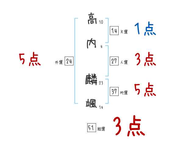 総運![]() | 高内麟颯さんの総運は51画の3つ星!変化が激しく、危険に注意。堅実な性格。 あなたの人生を表す1番重要な運勢です。生涯を通じて影響する総合運となり、主に50歳以降の晩年期に影響を及ぼします。 |