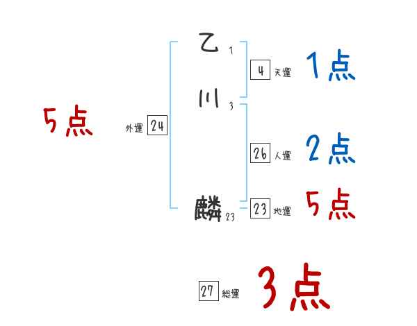 外運![]() | 乙川麟さんの外運は24画の5つ星!家庭運が良く順調な人生。金運にも恵まれる。 生活面を象徴する運勢です。外部から受ける影響力を表し、結婚運、家庭運や職場、環境への順応性を表します。 |
