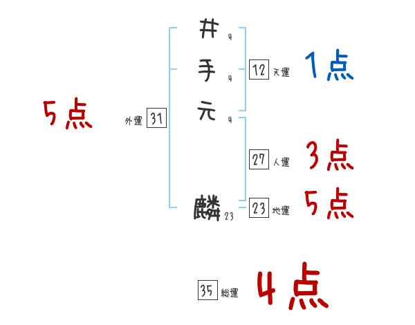 総運![]() | 井手元麟さんの総運は35画の4つ星!温厚な性格で感受性が高い。穏和な性格で人望が厚い。 あなたの人生を表す1番重要な運勢です。生涯を通じて影響する総合運となり、主に50歳以降の晩年期に影響を及ぼします。 |