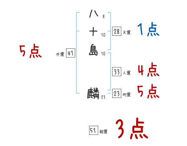 天運![]() | 八十島麟さんの天運は28画の1つ星!家庭環境に注意。スポーツで活躍できる能力があるかも。 家系が持つ宿命的な運勢を表します。祖先から受け継いだ苗字ですので自分の力が及びません。家柄を象徴します。 |