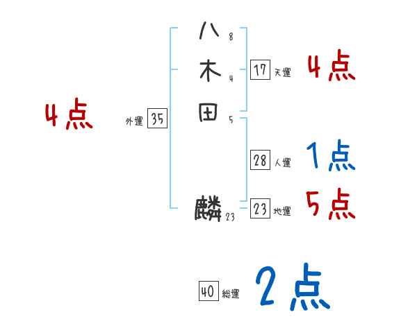 外運![]() | 八木田麟さんの外運は35画の4つ星!温厚な性格で感受性が高い。穏和な性格で人望が厚い。 生活面を象徴する運勢です。外部から受ける影響力を表し、結婚運、家庭運や職場、環境への順応性を表します。 |