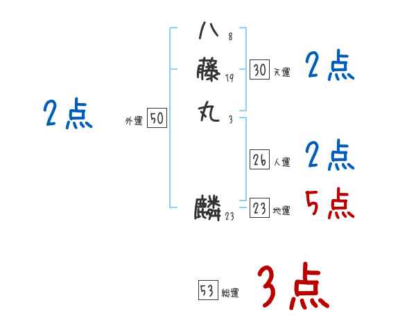 天運![]() | 八藤丸麟さんの天運は30画の2つ星!浮き沈みの激しさに注意しましょう。 家系が持つ宿命的な運勢を表します。祖先から受け継いだ苗字ですので自分の力が及びません。家柄を象徴します。 |