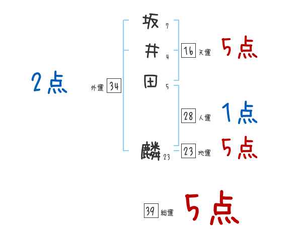 総運![]() | 坂井田麟さんの総運は39画の5つ星!社交性に優れ人望が厚い。人の上に立ち成功する。 あなたの人生を表す1番重要な運勢です。生涯を通じて影響する総合運となり、主に50歳以降の晩年期に影響を及ぼします。 |