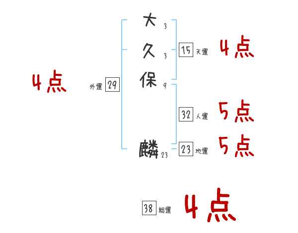 外運![]() | 大久保麟さんの外運は29画の4つ星!完全主義で才能がある。厳格な心の持ち主。 生活面を象徴する運勢です。外部から受ける影響力を表し、結婚運、家庭運や職場、環境への順応性を表します。 |