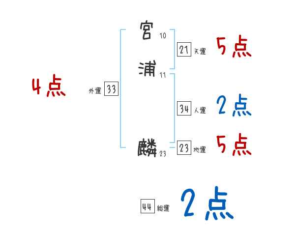 天運![]() | 宮浦麟さんの天運は21画の5つ星!統率力がある。独立し成功する。名誉を手に入れる。 家系が持つ宿命的な運勢を表します。祖先から受け継いだ苗字ですので自分の力が及びません。家柄を象徴します。 |