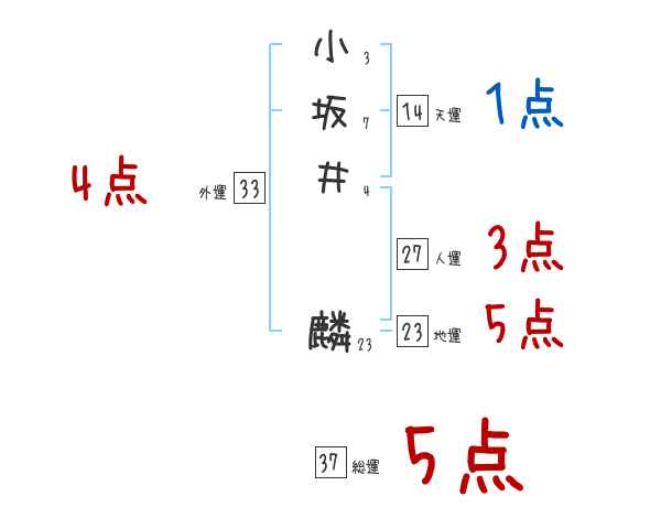 総運![]() | 小坂井麟さんの総運は37画の5つ星!努力家で順応性に優れる。現実的な考え方ができ忠実に物事をこなす。 あなたの人生を表す1番重要な運勢です。生涯を通じて影響する総合運となり、主に50歳以降の晩年期に影響を及ぼします。 |