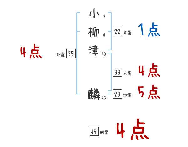 外運![]() | 小柳津麟さんの外運は35画の4つ星!温厚な性格で感受性が高い。穏和な性格で人望が厚い。 生活面を象徴する運勢です。外部から受ける影響力を表し、結婚運、家庭運や職場、環境への順応性を表します。 |