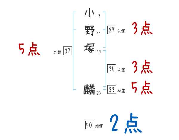 外運![]() | 小野塚麟さんの外運は37画の5つ星!努力家で順応性に優れる。現実的な考え方ができ忠実に物事をこなす。 生活面を象徴する運勢です。外部から受ける影響力を表し、結婚運、家庭運や職場、環境への順応性を表します。 |