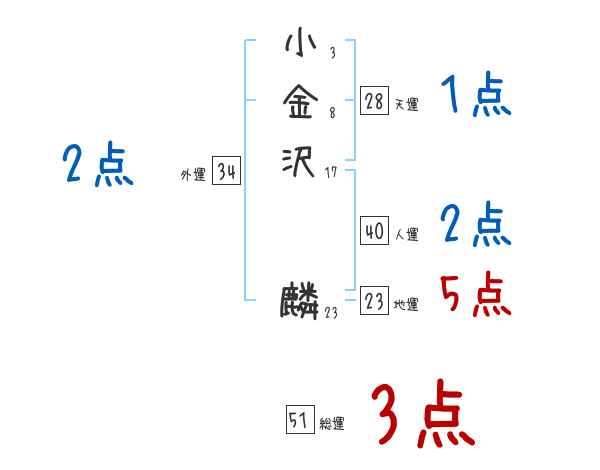 外運![]() | 小金沢麟さんの外運は34画の2つ星!独創性に優れるが、自尊心が強く災難に注意しましょう。 生活面を象徴する運勢です。外部から受ける影響力を表し、結婚運、家庭運や職場、環境への順応性を表します。 |