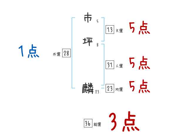 天運![]() | 市坪麟さんの天運は13画の5つ星!才能に恵まれ人気がある。名声を手に入れる。円満な人生。 家系が持つ宿命的な運勢を表します。祖先から受け継いだ苗字ですので自分の力が及びません。家柄を象徴します。 |
