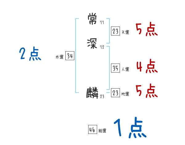天運![]() | 常深麟さんの天運は23画の5つ星!想像力に優れ活力がある。一代で成功し名誉を手に入れる。 家系が持つ宿命的な運勢を表します。祖先から受け継いだ苗字ですので自分の力が及びません。家柄を象徴します。 |