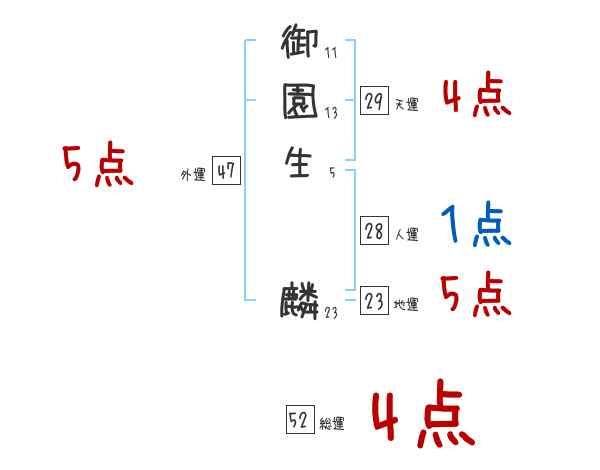外運![]() | 御園生麟さんの外運は47画の5つ星!実力が開花し発展する円満な人生。財に恵まれる。 生活面を象徴する運勢です。外部から受ける影響力を表し、結婚運、家庭運や職場、環境への順応性を表します。 |
