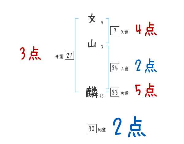 総運![]() | 文山麟さんの総運は30画の2つ星!浮き沈みの激しさに注意しましょう。 あなたの人生を表す1番重要な運勢です。生涯を通じて影響する総合運となり、主に50歳以降の晩年期に影響を及ぼします。 |