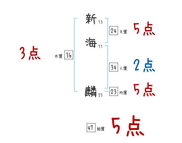 外運![]() | 新海麟さんの外運は36画の3つ星!先見性が豊かです。多少神経質で苦労することも。 生活面を象徴する運勢です。外部から受ける影響力を表し、結婚運、家庭運や職場、環境への順応性を表します。 |