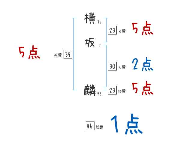 天運![]() | 横坂麟さんの天運は23画の5つ星!想像力に優れ活力がある。一代で成功し名誉を手に入れる。 家系が持つ宿命的な運勢を表します。祖先から受け継いだ苗字ですので自分の力が及びません。家柄を象徴します。 |